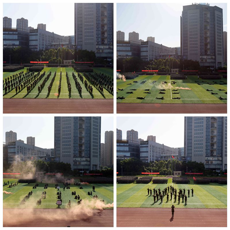 庄严的国歌声中五星红旗冉冉升起,军训总结大会正式拉开帷幕。11个分列式方队斗志昂扬,迈着整齐划一的步伐依次通过主席台,在璀璨的阳光下,他们步伐铿锵,气宇轩昂。随后依次进行了庆祝建党百年方阵、匕首操方阵、擒敌拳方阵、战术旗语方阵、战术方阵和战地医疗紧急救护方阵以及国旗班枪操方阵的军训成果展示。整齐划一的特色方阵充分展示了西财学子朝气蓬勃的青春活力和昂扬向上的精神风貌,将现场气氛推向高潮。