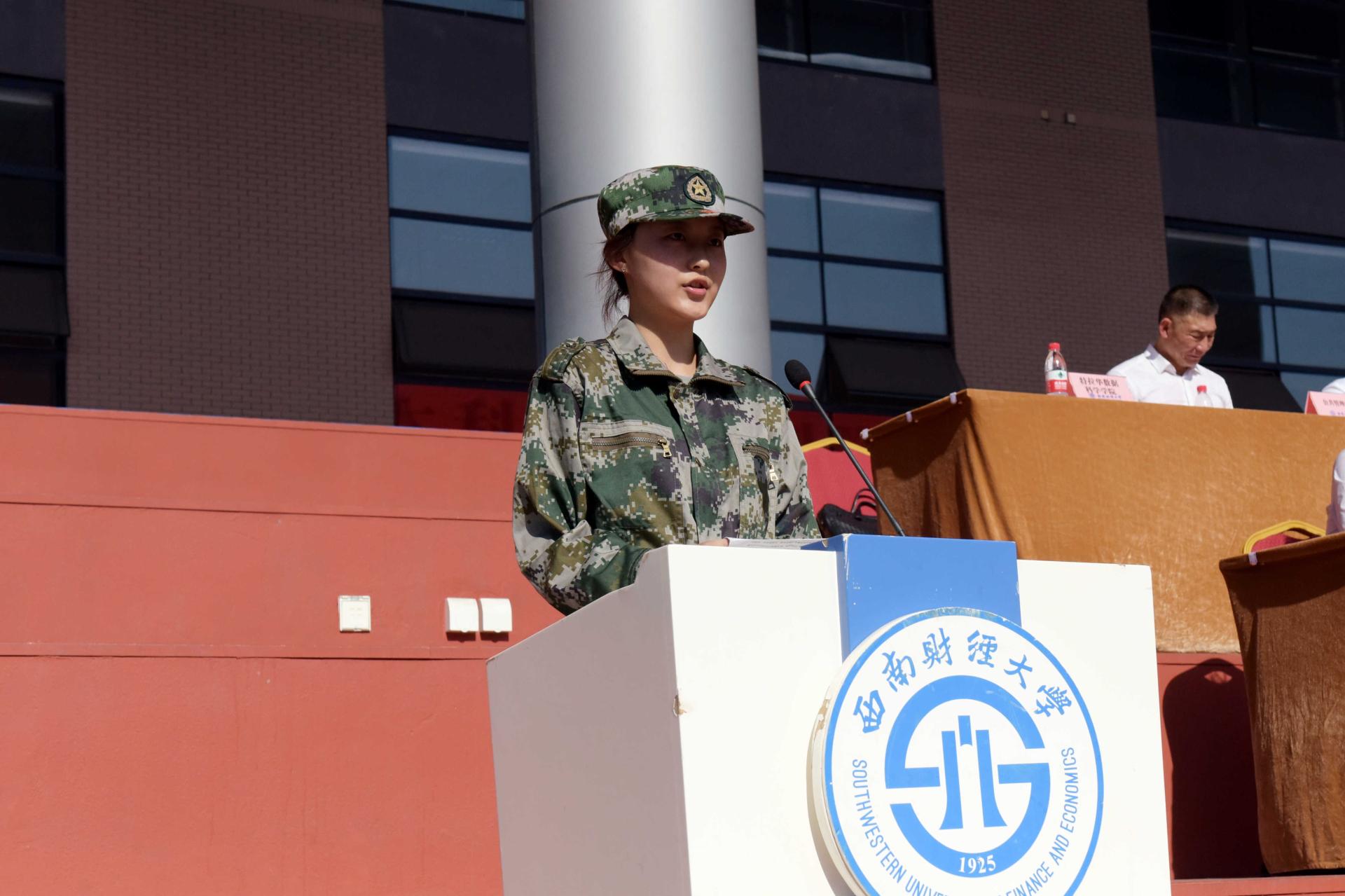 军训团团长肖文清宣读《嘉奖令》。校领导为本次军训评选出是的450名“优秀学员”代表、10名“优秀教官”和10名“优秀指导员”颁发荣誉证书。军训优秀学员代表谭沛珊同学发言。